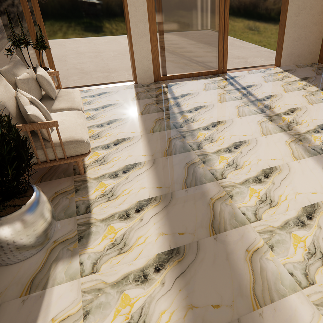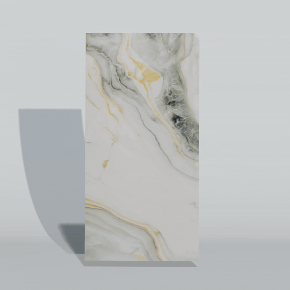 Porcelanato tipo mármol abstracto, con vetas fluidas en blanco, gris y dorado. Su diseño elegante y acabado pulido lo hace adecuado para interiores que buscan una estética sofisticada y contemporánea.