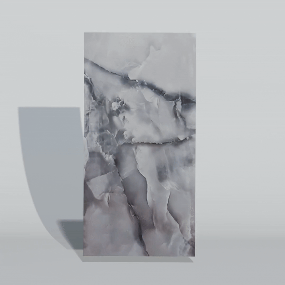 Porcelanato tipo mármol en tonos grises con vetas orgánicas, acabado pulido alto brillo. Baja porosidad, alta resistencia al desgaste y al tránsito, apto para pisos y revestimientos interiores. Bordes rectificados para juntas mínimas.
