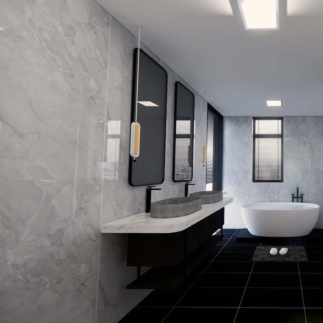 Porcelanato tipo mármol en formato 60×120 cm, con fondo gris claro y vetas difusas en tonos grises y blancos, que ofrece un diseño uniforme para generar continuidad visual en paredes y pisos, con acabado pulido de superficie lisa y reflectante.