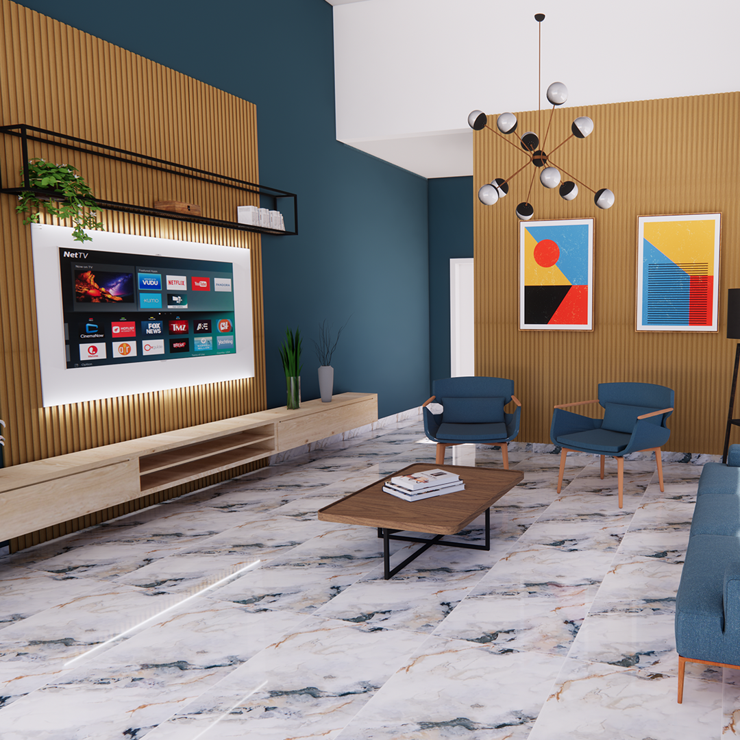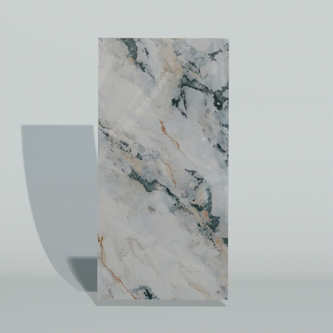 Porcelanato tipo mármol pulido, con vetas en tonos blanco, gris, beige y acentos en naranja-marrón. Su diseño natural y superficie brillante lo hacen adecuado para interiores que requieren una apariencia sofisticada y uniforme.