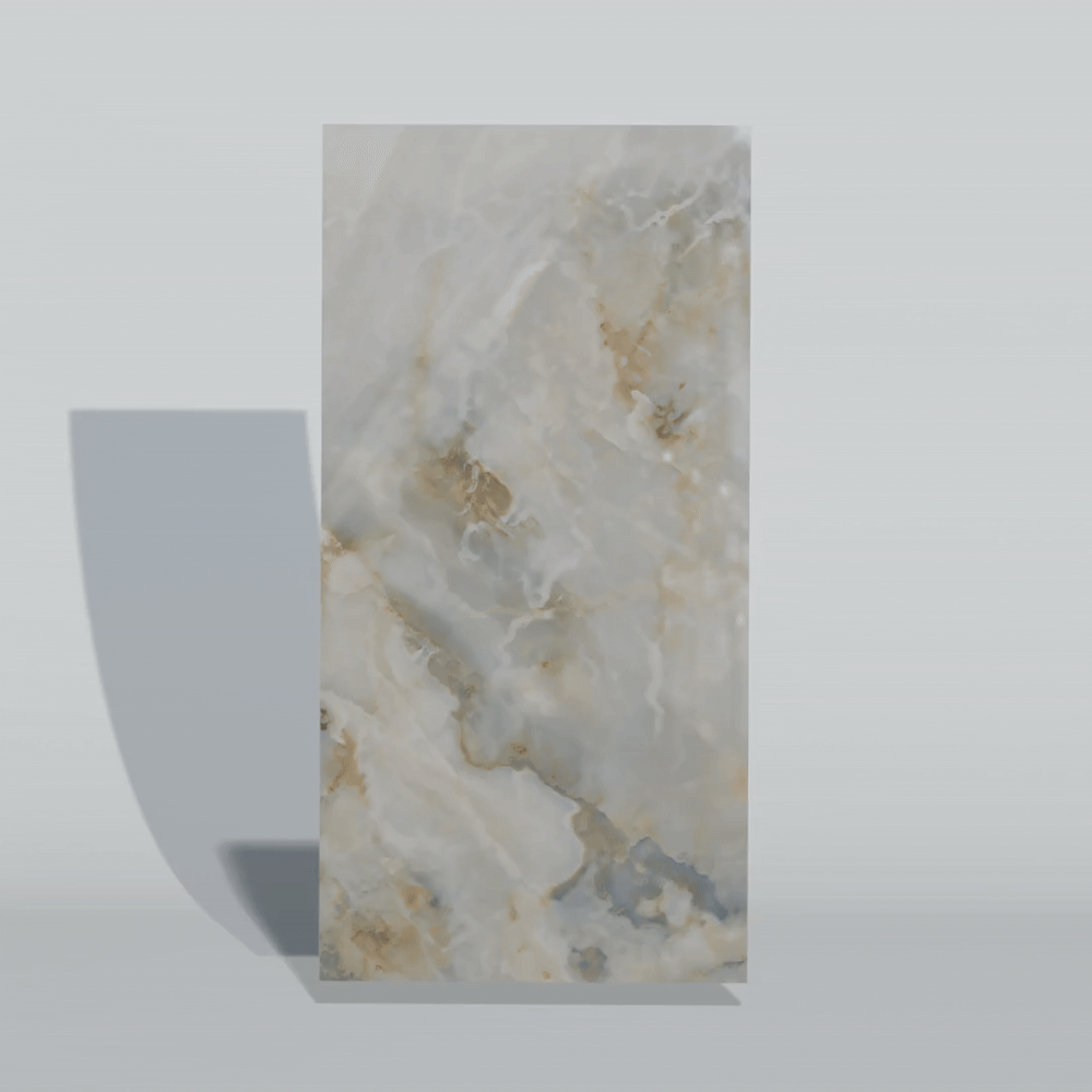 Porcelanato tipo ónix en tonos crema y gris con vetas doradas y ámbar, acabado pulido alto brillo. Baja porosidad, alta resistencia al desgaste y al tránsito; apto para pisos y revestimientos interiores. Bordes rectificados para juntas mínimas